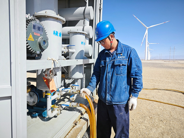8月的戈壁灘,烈日灼灼,目前每日可保障完成兩臺(tái)箱變?yōu)V油進(jìn)度,確保大風(fēng)季前完成67臺(tái)箱變?yōu)V油工作,隨著濾油工作的開展,將有效提升哈密清潔能源公司發(fā)電設(shè)備的健康運(yùn)行水平,提高大風(fēng)季期間發(fā)電可靠性和安全性,為公司安全穩(wěn)定運(yùn)行打下了堅(jiān)實(shí)的基礎(chǔ)。