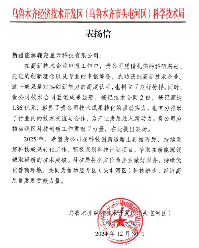 表揚(yáng)信中對(duì)翱翔公司扎實(shí)的科研基礎(chǔ)、先進(jìn)的創(chuàng)新理念及專業(yè)的申報(bào)籌備提出了高度認(rèn)可,在技術(shù)合同登記工作中,登記額度達(dá)1.86億元提出表揚(yáng),期望今后雙方共同為推動(dòng)烏魯木齊市經(jīng)開區(qū)(頭屯河區(qū))科技進(jìn)步、經(jīng)濟(jì)高質(zhì)量發(fā)展貢獻(xiàn)力量。