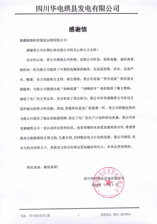 踐行國(guó)企擔(dān)當(dāng) 迎來(lái)聯(lián)名致謝——哈密運(yùn)銷公司收到四川華電等多家單位聯(lián)名感謝信