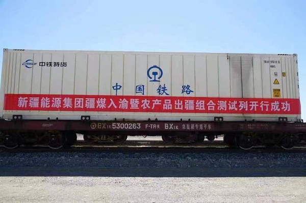 6月30日,51組滿載保供任務(wù)的煤炭集裝箱和2組新疆優(yōu)質(zhì)農(nóng)產(chǎn)品冷鏈集裝箱,由新疆哈密市哈密站發(fā)往重慶市小南埡站,這是新疆農(nóng)副產(chǎn)品首次搭乘“疆煤外運(yùn)”列車,實(shí)現(xiàn)了新疆農(nóng)副產(chǎn)品和煤炭組合測(cè)試列車零的突破。
