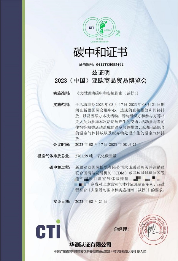 自今年7月起,泓源碳資產(chǎn)公司積極對接中國—亞歐博覽會(huì)秘書處、新疆亞歐國際博覽有限公司、新疆中微子碳投科技有限公司等相關(guān)單位,達(dá)成助力本屆亞歐商博會(huì)“碳中和”合作。在商博會(huì)開展過程中,對展會(huì)進(jìn)行“碳”盤查,計(jì)算出展會(huì)共計(jì)產(chǎn)生碳排放量達(dá)2762噸,計(jì)算過程由華測認(rèn)證公司全程認(rèn)證核證。本屆亞歐商博會(huì)產(chǎn)生的全部碳排放量已由泓源碳資產(chǎn)公司通過購買自愿減排量實(shí)現(xiàn)中和抵消,并依據(jù)《大型活動(dòng)碳中和實(shí)施指南(試行)》向亞歐商博會(huì)出具“碳中和”、“綠色展會(huì)”證書。