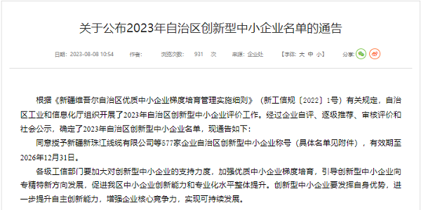 為增強(qiáng)企業(yè)核心競(jìng)爭(zhēng)力,實(shí)現(xiàn)可持續(xù)發(fā)展,準(zhǔn)東環(huán)境公司組織開(kāi)展“創(chuàng)新型中小企業(yè)”申報(bào)工作。完成資料整理準(zhǔn)備、自評(píng)后進(jìn)行了申報(bào),經(jīng)過(guò)逐級(jí)審核、推薦,最終于2023年8月8日,被自治區(qū)工業(yè)和信息化廳認(rèn)定為“創(chuàng)新型中小企業(yè)”。