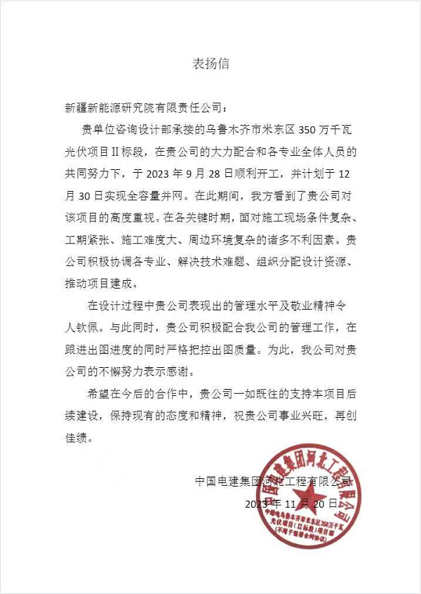 近日,新能源研究院收到中國(guó)電建集團(tuán)河北工程有限公司發(fā)來(lái)的表?yè)P(yáng)信,信中對(duì)新能源研究院圓滿完成烏魯木齊市米東區(qū)350萬(wàn)千瓦光伏項(xiàng)目Ⅱ標(biāo)段咨詢?cè)O(shè)計(jì)任務(wù)表示高度肯定感謝。